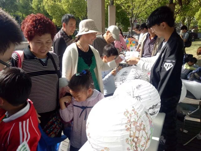 展示区刚布置好,便有锻炼的老爷爷、老奶奶被精美的灯笼吸引过来,志愿者邀请他们来猜灯谜,并向他们介绍灯谜文化。随着时间的推移,越来越多的市民被我们的活动吸引了过来,看彩灯,猜灯谜,好不热闹。志愿者们在行人猜出谜底后,还为他们介绍有关谜底的科学文化知识,现场非常热闹。