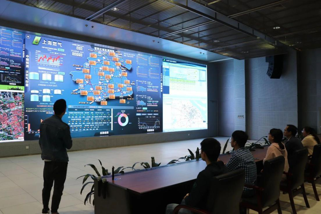 在俞经理的引领下,师生参观了上海市燃气调度中心。王英臣为师生详细介绍了上海燃气集团的相关业务情况,演示了申能集团可视化数据综合展示平台、预警处置系统、智能管网调度系统等。目前,上海的各级天然气管网已实现信息化管理,从上游高压输气管道到末端民用管道均实现实时监控,平时可以做到闭环控制,当接到故障报告时,上海燃气的检修工人可以做到在30分钟内到达现场,进行问题排查。
