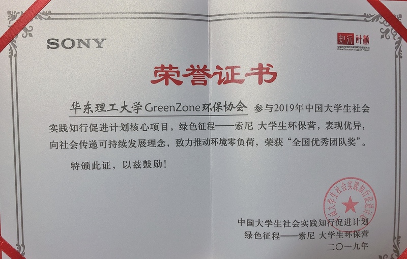 由团中央学校部组织发起的2019年中国大学生社会实践知行促进计划的核心项目“绿色征程-索尼”大学生环保营于近日圆满落幕。我校环保协会荣获2019年“绿色征程-索尼”大学生环保营全国优秀团队奖。
