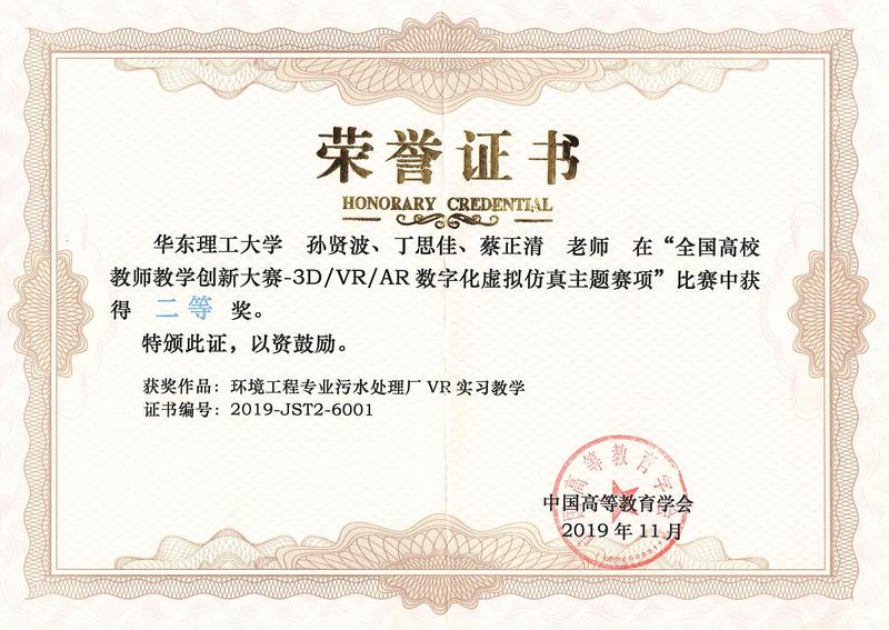 2019年11月1日至3日,由中国高等教育学会举办的“全国高校教师教学创新大赛-3D/VR/AR数字化虚拟仿真主题赛项”在南京顺利举行。本次赛事中,我校教师孙贤波、丁思佳、蔡正清负责的《环境工程专业污水处理厂VR实习教学》荣获二等奖。