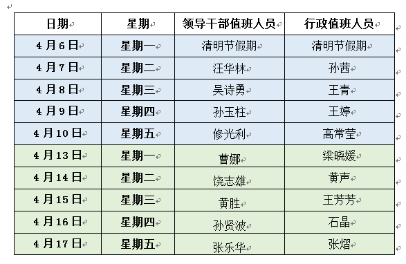【学院综合】疫情防控期间必赢242net官网领导干部及行政人员值班安排(4月7日-4月17日)