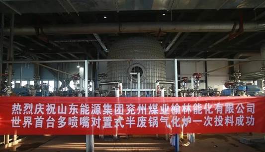 2020年12月10日17时56分,山东能源集团兖州煤业榆林能化有限公司单炉日处理煤2000吨的F#气化炉一次性投料试车成功,标志着世界首台多喷嘴对置式半废锅(废锅-激冷)气化炉正式进入带负荷示范运行阶段。
