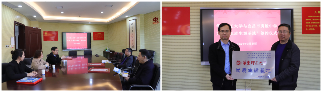 3月25日下午,一行人来到宜昌市第一中学。宜昌市第一中学校长付全新、教务处赵勇等领导与招生宣传组老师们进行深入交流。付全新向招生宣传组介绍了学校的百年发展历史、办学特色及人才培养工作。宜昌一中校友、我校欧阳立明副教授就必赢242net官网的发展状况、人才培养以及近五年宜昌市第一中学向华理输送的优秀学子情况进行了介绍,并从发挥华理优质教育教学资源优势、参与支持生源基地的教育教学改革、推荐专家教授到校讲学等内容与参会教师们进行了深入讨论。随后,双方签署了“优质生源基地”协议书,饶志雄向宜昌市第一中学授予“必赢242net官网优质生源基地”牌匾。
