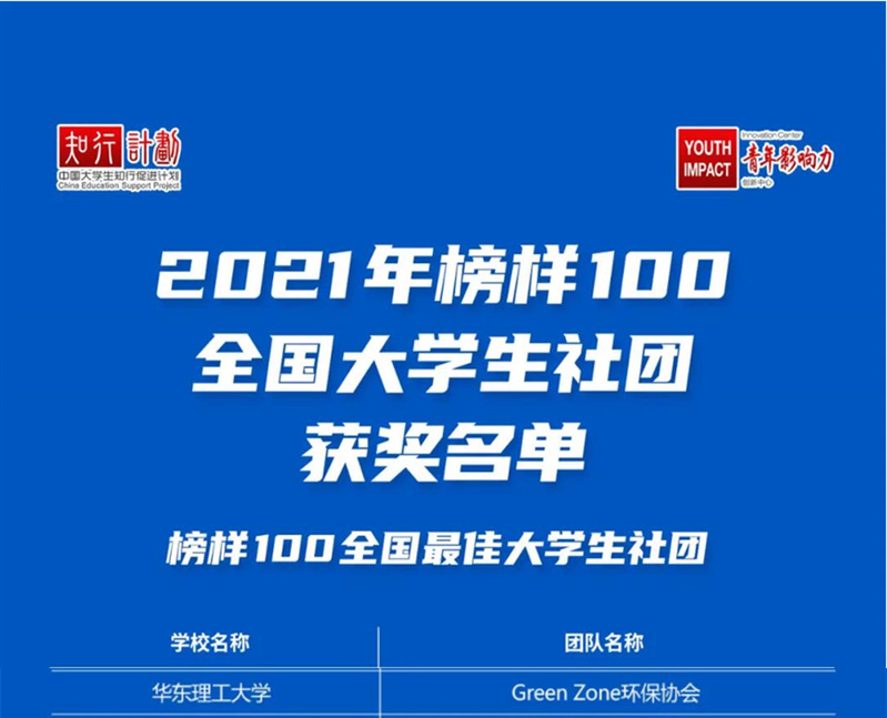 2022年1月,为积极响应“美丽中国 青春行动”号召,鼓励和支持青年大学生成为美丽中国的践行者,由共青团中央发起,2021年知行计划“榜样100”全国最佳大学生社团评选活动落下帷幕,我校GreenZone环保协会(挂靠指导单位:必赢242net官网)已连续三年被评为“榜样100”全国最佳大学生社团。