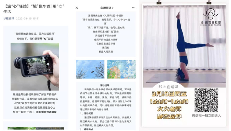 通过调研研究生需求,开展精准服务:一是组织以研究生创新能力提升为主题的线上系列学术讲座,邀请不同学科和校内外专家开设讲座,分享多学科工具和手段;二是组织开展职场导航系列学术讲座,邀请校友和教师分享职场“酸甜苦辣”和 “成功秘诀”,征集并推送多期就业招聘信息;三是学院团委开启“花朝夕拾 共植春来”等活动,云端踏青,播种希望;四是学院工会组织线上瑜珈活动,组织观看《一起抗疫“音”为有你——三八红旗手讲师“音乐疗愈课程”》线上音乐会,提气鼓劲,坚持不懈。