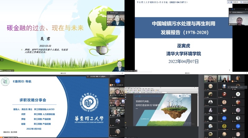 “E路同行”系列活动聚焦学科前沿、“双创能力提升、就业技能培训等主题开展。来自清华大学、南京大学、上海市石油天然气交易中心、上海虹口中联工发科技创新中心、上海异工同智信息科技有限公司、中法水务有限公司等的多位专家学者、行业翘楚、优秀校友,受邀开展线上交流,围绕“双碳”战略、科学素养、学科竞赛、求职技巧、生涯规划等与学生进行分享。截至目前,该系列活动已成功举办8期,参与学生1500余人次,不断激励学生关注学科前沿,创新研究视野,引导做好生涯规划。