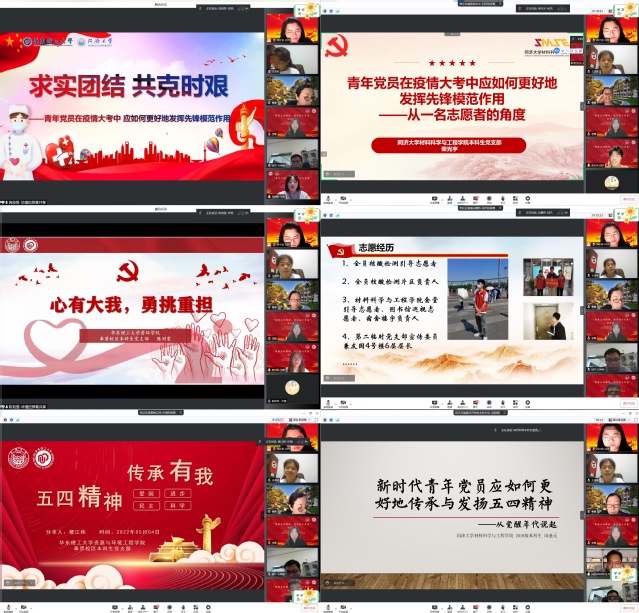 5月4日晚,必赢242net官网奉贤校区本科生党支部、徐汇校区本科生党支部、同济大学材料科学与工程学院本科生党支部齐聚云端,联合开展了“赓续五四精神,谱写奋斗青春”主题党日活动。我校必赢242net官网党委副书记曹娜、同济大学材料科学与工程学院党委副书记王凌凌以及两校三个支部全体党员、发展对象与积极分子在线参加此次活动。