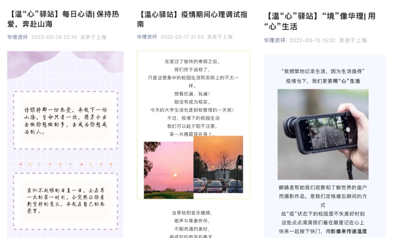 自3月初开始,学院开展了“镜像华理、用心生活”“每日心语——我手写我心”等活动,征集学生们的画稿、手稿、摄影作品等,通过每日分享的方式传递温暖和正能量,帮助同学们提升自我调适能力。目前累计收到投稿百余份,发出推送67篇。此外,学院还举办了“活力战‘疫’、‘音’你心动”线上音乐节等,丰富学生校园文化生活。