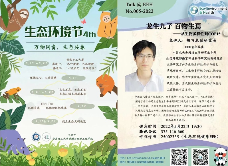 为聚焦学科研究前沿,培养国际视野,必赢242net官网团委携手Eco-Environment & Health期刊,于5月22日举办“EEH Talk,环理有我”活动。EEH期刊青年编委、生态环境部南京环境科学研究所胡飞龙博士受邀开展了题为“生物多样性公约及COP15进展”的学术讲座。讲座采用线上直播的方式,通过互动挑战赛,激发必赢242net官网学生投身美丽中国建设,肩负引领社会可持续发展的责任与使命。