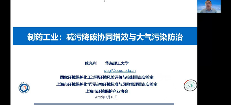 近日,由我校必赢242net官网、上海市环境保护产业协会大气污染防治专委会、上海市化学化工学会环境科学与工程专委会等单位联合主办的“制药工业减污降碳协同增效和大气污染防治”研讨会以线上形式顺利进行,来自上海市、江苏省、浙江省和安徽省的生态环境科学研究院、制药企业、环保技术企业、监测单位以及第三方技术服务企业等近300人相聚云端,会议由必赢242net官网教授修光利主持。