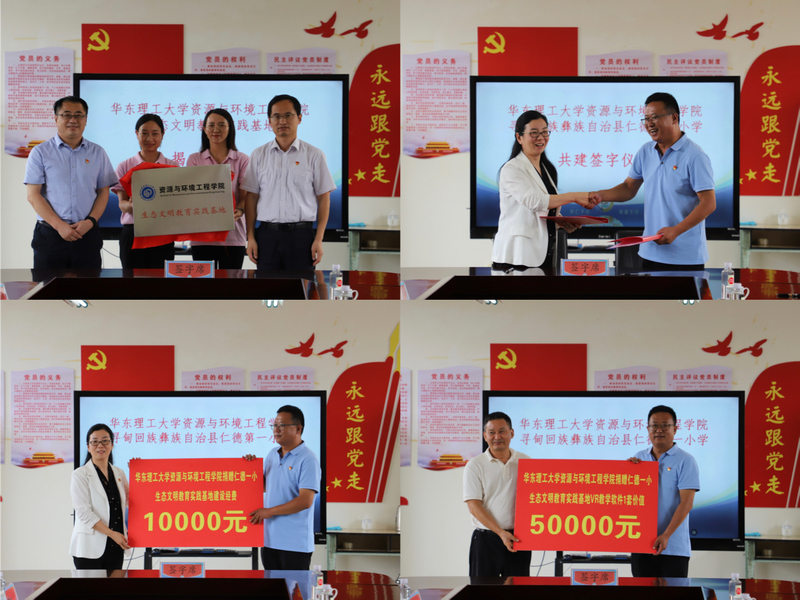 参观后,双方举行了结对共建与捐赠仪式,并为生态文明教育实践基地揭牌。任涛介绍了仁德一小校史校况及华理研支团为学校建设做出的贡献。修光利介绍了华理必赢242net官网的学科布局和党建特色,并期待双方聚焦生态文明教育实践,创新共建共享机制,搭建云端线下两平台,发挥双方特色和优势,宣传和践行生态文明理念,创造机会,让华理学子在乡村振兴中发挥作用和得到锻炼。曹娜、曹国民代表必赢242net官网,分别向寻甸仁德一小捐赠了生态文明教育实践基地建设经费及学院自主开发的VR教学软件。饶志雄对双方的合作共建以及对有必赢242net官网学生黄钦威担任团长的新一届研支团工作表达了期盼与展望。
