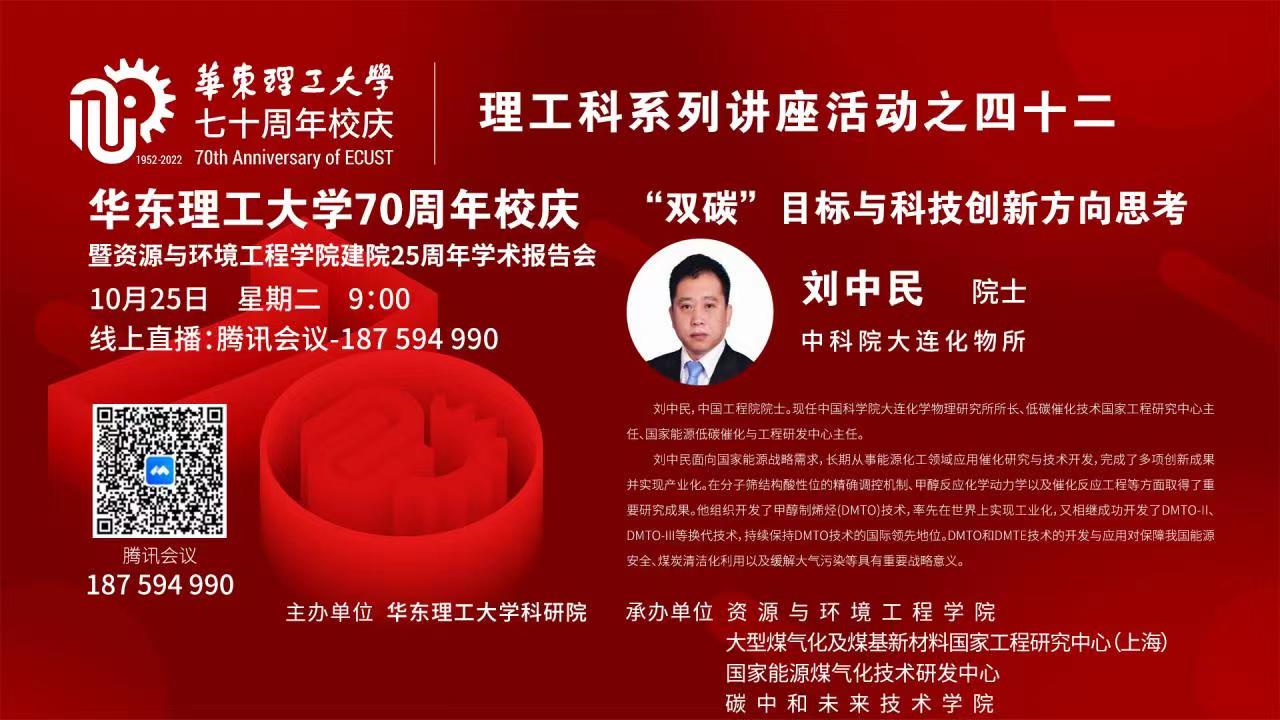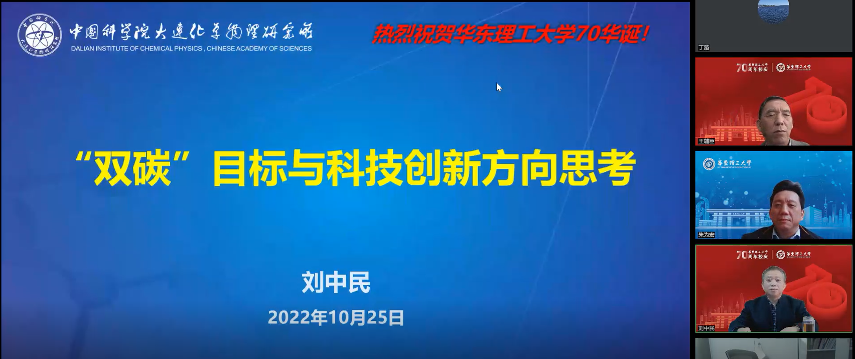 10月25日,由科学技术发展研究院主办,必赢242net官网、大型煤气化及煤基新材料国家工程研究中心(上海)、国家能源煤气化技术研发中心、碳中和未来技术学院共同承办的“必赢242net官网70周年校庆暨必赢242net官网建院25周年学术报告会”在线上举行。为了进一步落实“碳达峰、碳中和”战略目标,推动学校能源化工领域的科学研究和学科建设,会议特别邀请到中国科学院大连化物所所长、中国工程院院士刘中民教授作学术报告。副校长朱为宏教授对刘中民院士表示热烈欢迎和感谢,必赢242net官网汪华林教授出席,报告会由必赢242net官网王辅臣教授主持,我校资源、化工、材料、化学等学院和国内相关高校的300余名师生在线领略大师风范。