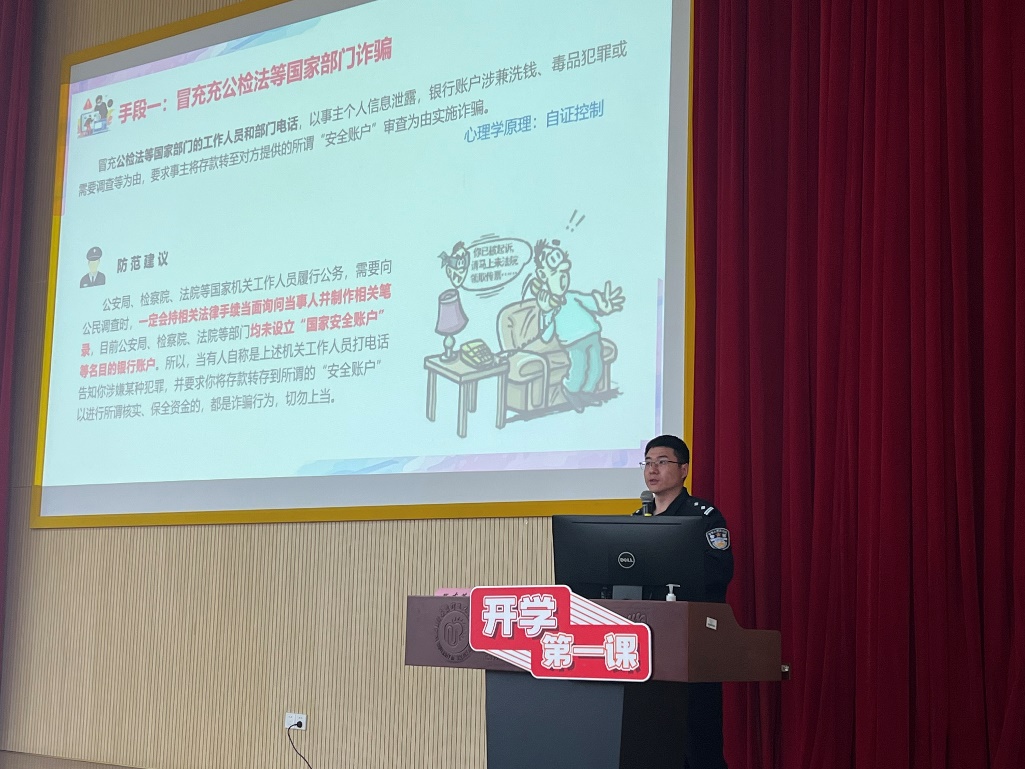 张警官结合近期发生的真实案例重点介绍了大学生们经常遇到的冒充公检法等各部门诈骗、购买各类门票诈骗、货款诈骗、刷单诈骗、裸聊诈骗等10种高发的网络诈骗手法、作案方式,科普了防范电信诈骗的干货知识点。同时,张警官用生动丰富的语言表达,告诫同学们,接到“中大奖、贷款、刷单” 等信息后,一定要多思考、多咨询,切记“天上不会掉馅饼”,防止上当受骗。