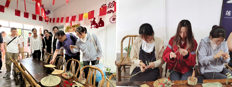 座谈会后,必赢242net官网师生在金泽镇、莲湖村干部的讲解下开展“行走的大思政课”,实地参观了莲湖村人居环境、院士工作站、青西郊野公园水上森林、党群服务中心及沿途的现代特色农业,学生们还在“莲湖幸福驿站”参与了“非遗”文化“茭白叶绿色编织”活动,茭白叶编结是历史悠久的草编、柳编技艺的发展演变与当地茭白种植业相结合而出现的民间手工编结技艺,把废弃的茭叶通过绿色编结的方式,不仅消解利用了原本废弃的茭白叶、变废为宝,还保护了环境,现已成为当地新兴的特色农业产业。同学们一起动手编结实地见证了上海民间技艺的继承发展与创新发展,近距离感受莲湖村以生态文明建设引领乡村振兴的建设成果。