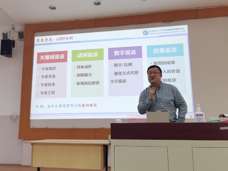 盖钧超老师以“如何做好职业发展”为主题,围绕“职业发展成功五问”做详细解读,着重讲授了简历设计思路和技巧,提醒求职者从岗位需求出发,用好USP法则,勉励同学们要善用资源,明确目标,敢于付出,勇于奋斗。