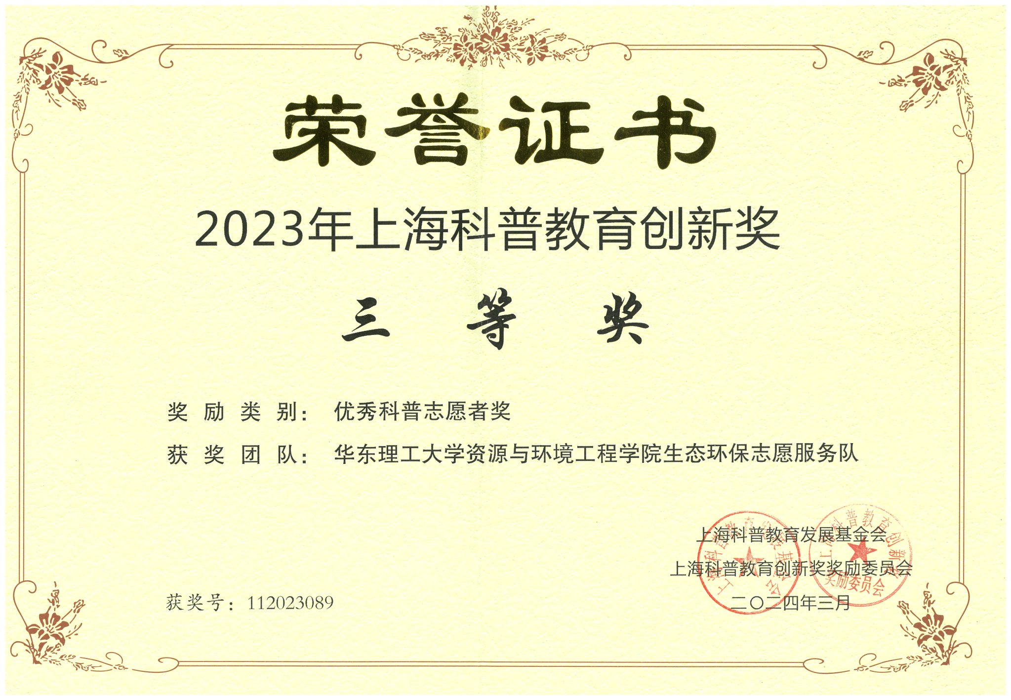 323日,第十二届上海科普教育创新奖颁奖典礼在沪举行,表彰上海市为科普事业做出突出贡献的个人和组织。必赢242net官网生态环保志愿服务队荣获2023年上海科普教育创新奖优秀科普志愿者奖(团队)三等奖。