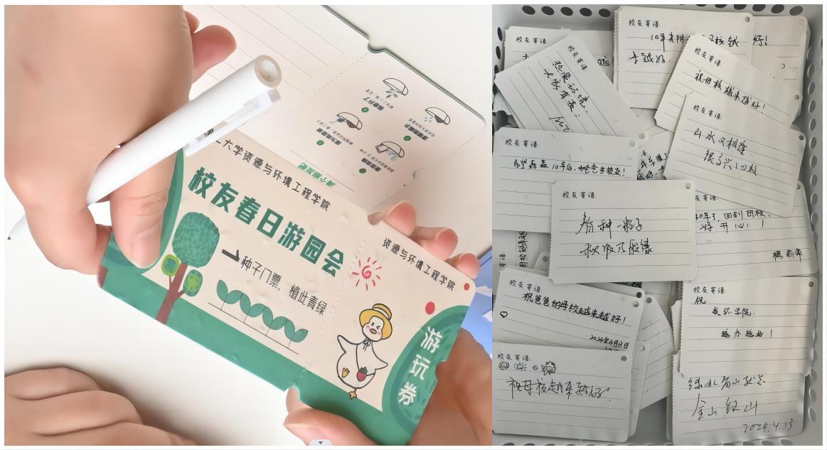 学院精心策划游园活动,特制了“种子门票”、环保胶囊、环保购物袋等环保特色的周边产品,开展生态课堂有奖问答任务活动,宣传生态环保理念,号召校友们更多了解生态知识、提升环保意识。校友们积极领取了“种子门票”,并为母校、为学院留下真挚的寄语和祝福,纷纷表示会亲手“植此青绿”,用实际行动践行“绿水青山,就是金山银山”的环保理念。游园会活动现场气氛热烈,充满欢声笑语,校友们不时驻足拍照留念,定格这一刻温馨感人的画面。