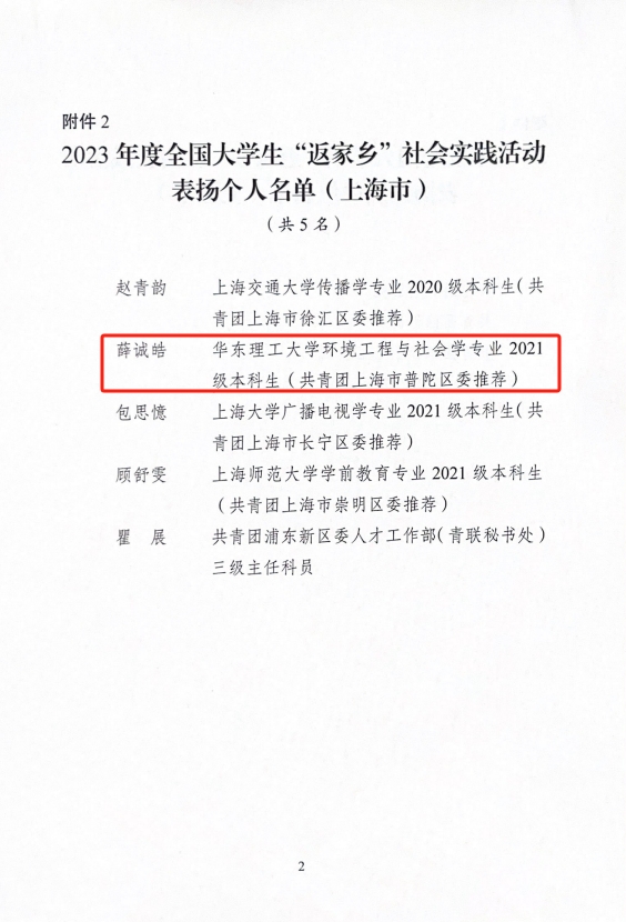 近日,共青团中央发布表扬信,对2023年度全国大学生“返家乡”社会实践活动中表现突出的组织单位、个人和特色项目予以通报表扬,必赢242net官网2021级环境工程社会学(双学位)专业薛诚皓同学获评2023年度全国大学生“返家乡”社会实践活动表扬个人。