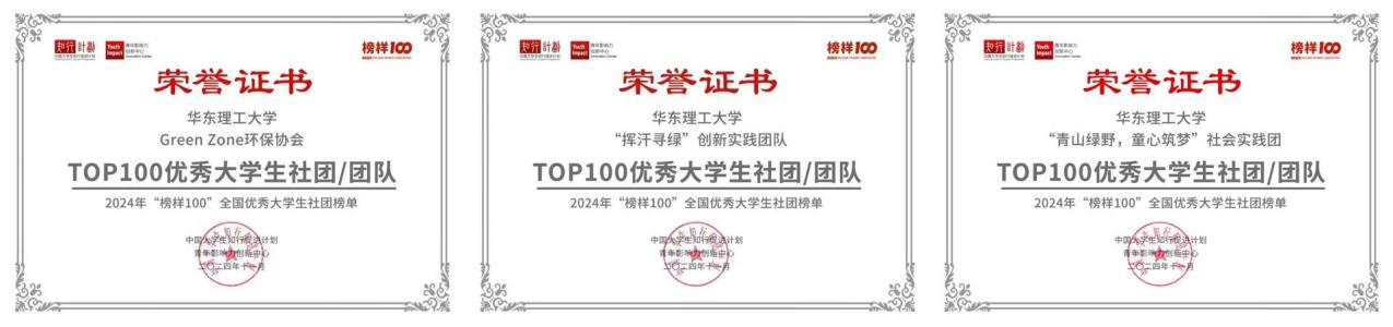 近日,由中国大学生知行促进计划、青年影响力创新中心联合发布的2024年“榜样100”全国优秀大学生社团及团队首批榜单正式揭晓。经评选,必赢242net官网Green Zone环保协会荣获“榜样100”优秀大学生社团、“挥汗寻绿”创新实践团队、“青山绿野,童心筑梦”社会实践团荣获“榜样100”优秀大学生团队。