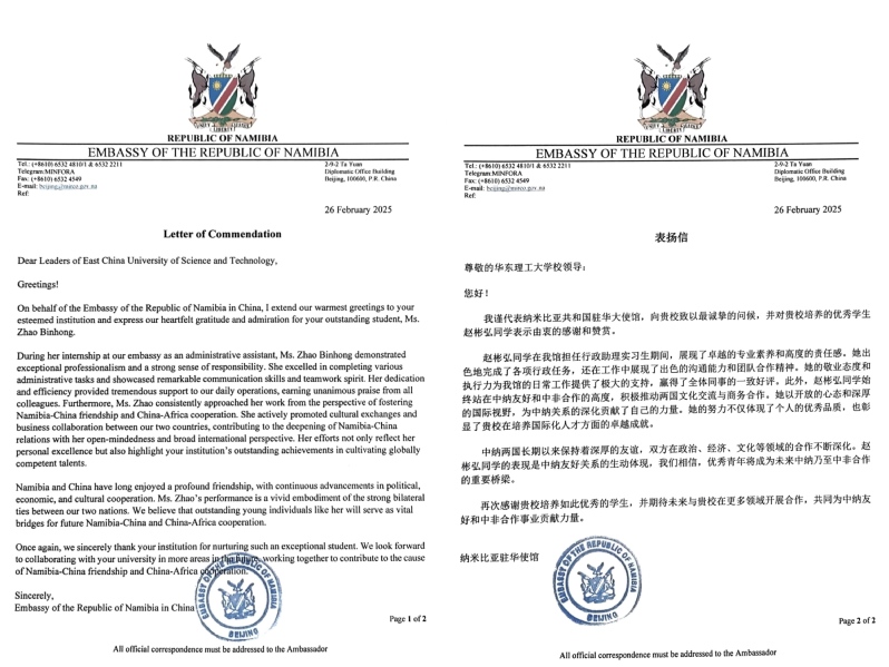 近日,纳米比亚共和国驻华大使馆向必赢242net官网发来表扬信,对必赢242net官网2021级能源与动力工程专业赵彬弘同学在大使馆担任行政助理实习生期间的出色表现予以表扬,也对必赢242net官网在国际化人才培养方面的卓越成就表示了由衷的感谢和赞赏,并期待未来在更多领域开展合作,共同为中纳友好和中非合作事业贡献力量。