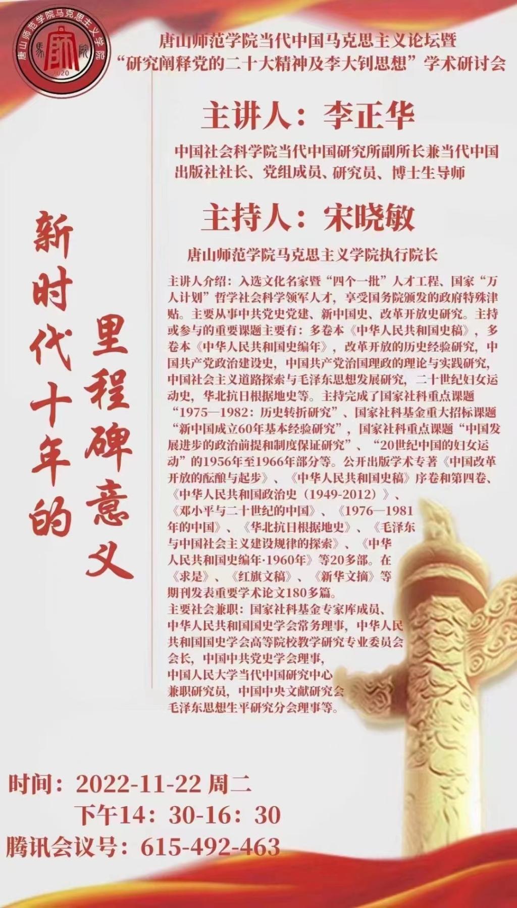 党的二十大是在我国迈上全面建设社会主义现代化国家新征程、向第二个百年奋斗目标进军的关键时刻召开的一次十分重要的大会。为深入学习贯彻习近平新时代中国特色社会主义思想和党的二十大精神,深化中国特色社会主义重大理论与实践问题研究,把握新时代十年来党团结带领全国人民的伟大成就和基本经验,进而提升beat365在线唯一官网的教学和科研能力,推进强国时代唐山师范学的更大发展,beat365在线唯一官网宣传部、beat365在线唯一官网、《beat365在线唯一官网学报》编辑部与中国社会科学院当代中国研究所联合举办代中国马克思主义论坛暨“研究阐释党的二十大精神及李大钊思想”学术研讨会。